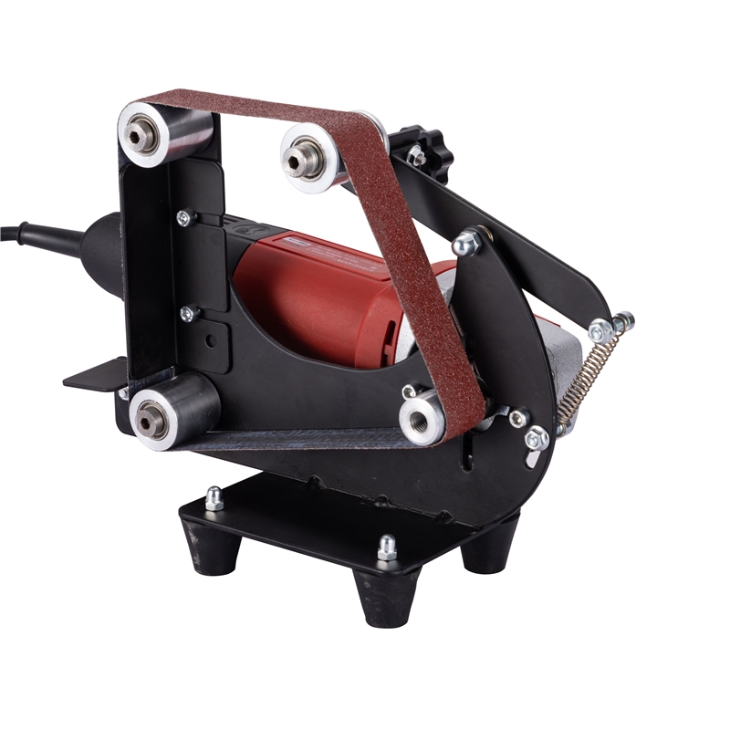 It consists of an electric motor that turns a pair of drums on which a continuous loop of sandpaper belt is mounted.